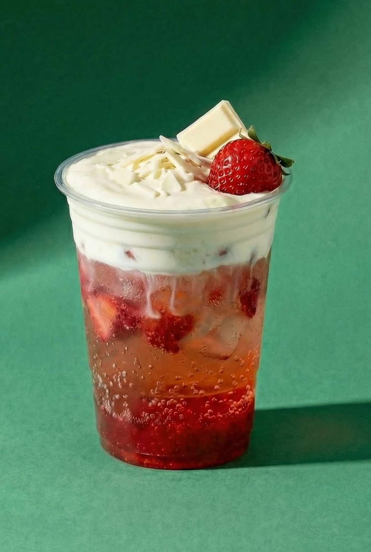 Light, bubbly, and dessert-like. Sparkling soda meets sweet strawberry and a luscious white chocolate cream topper, creating a refreshing treat with a smooth, creamy finish.