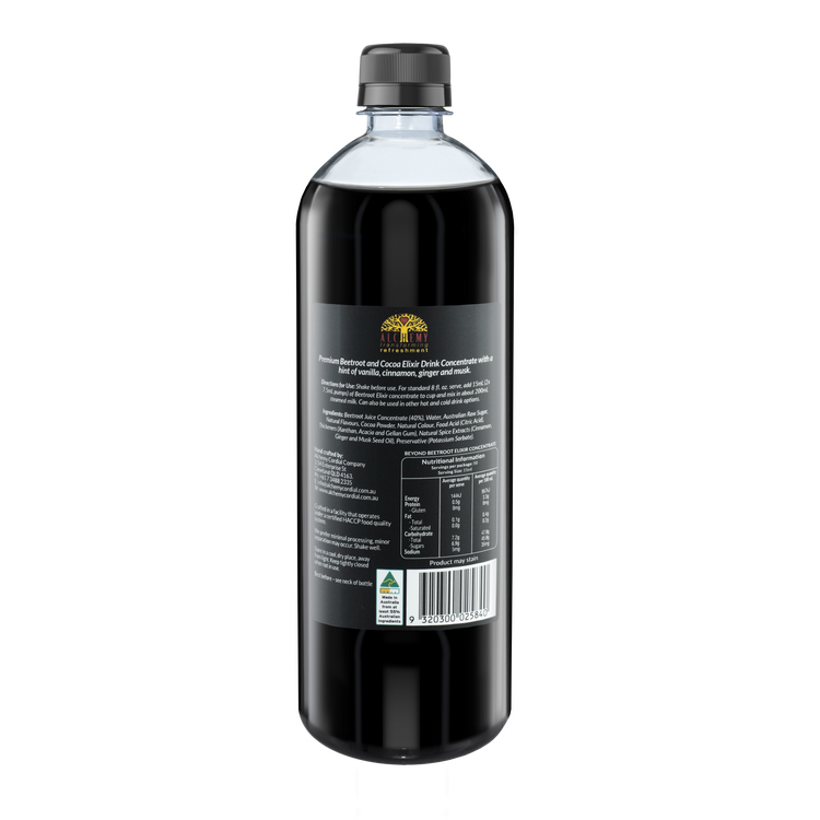 Beetroot Juice Concentrate (40%), Water, Australian Raw Sugar, Natural Flavours, Cocoa Powder, Natural Colour, Food Acid (Citric Acid), Thickeners (Xanthan, Acacia and Gellan Gum), Natural Spice Extracts (Cinnamon, Ginger and Musk Seed Oil), Preservative (Potassium Sorbate).