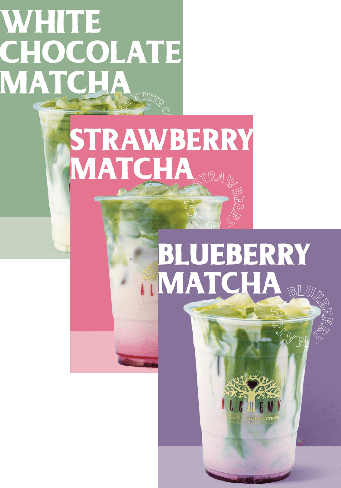 Includes 1 x Premium Matcha Concentrate (750ml), 1 x Alchemy Strawberry Syrup (750ml), 1 x Alchemy Blueberry Syrup (750ml), 1 x Alchemy White Chocolate Sauce (750ml), 4 x Pump, Recipe card/point of sale.